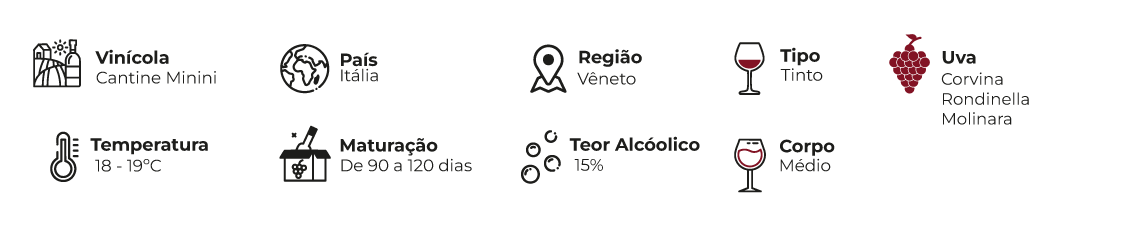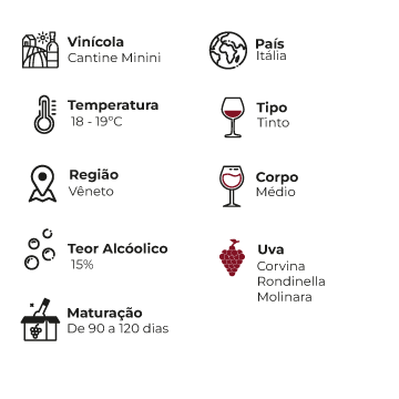 O Amarone della Valpolicella DOCG 2021, da vinícola Cantine Minini, é um dos grandes ícones do Vêneto e expressa com elegância a tradição da região. Produzido a partir das uvas Corvina, Rondinella e Molinara, este vinho nasce de um método clássico de elaboração que concentra aromas, estrutura e complexidade.