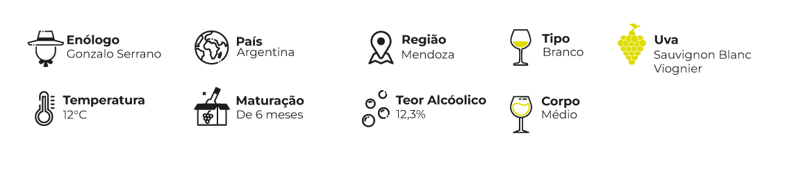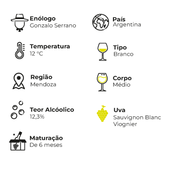 Técnica de Vinificação: Colheita manual. Sauvignon Blanc com fermentação em cubas de concreto e Viognier com fermentação em barrica.