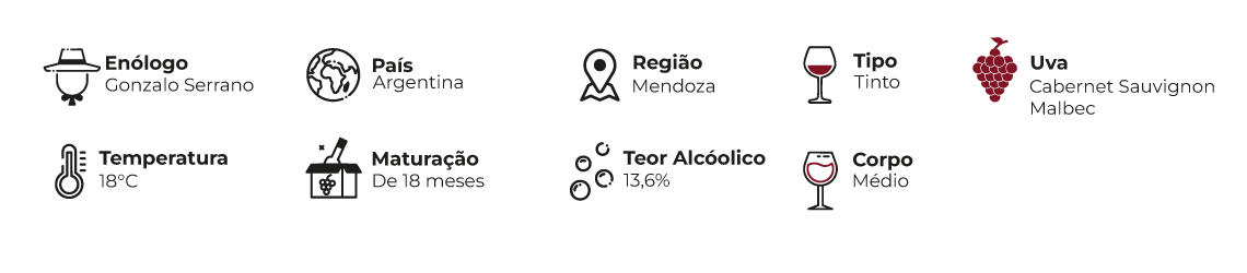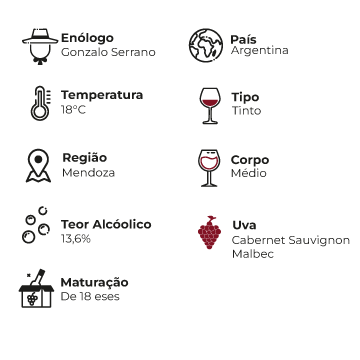 Notas de Prova: Tons vermelhos com nuances atijolados. Aromas de frutas vermelhas, alguma fruta preta madura proveniente da Malbec e suaves notas de pimenta oriundas da Cabernet Sauvignon. Notas de chocolate e cassis fornecidos pela madeira. Ótima estrutura e delicadeza.