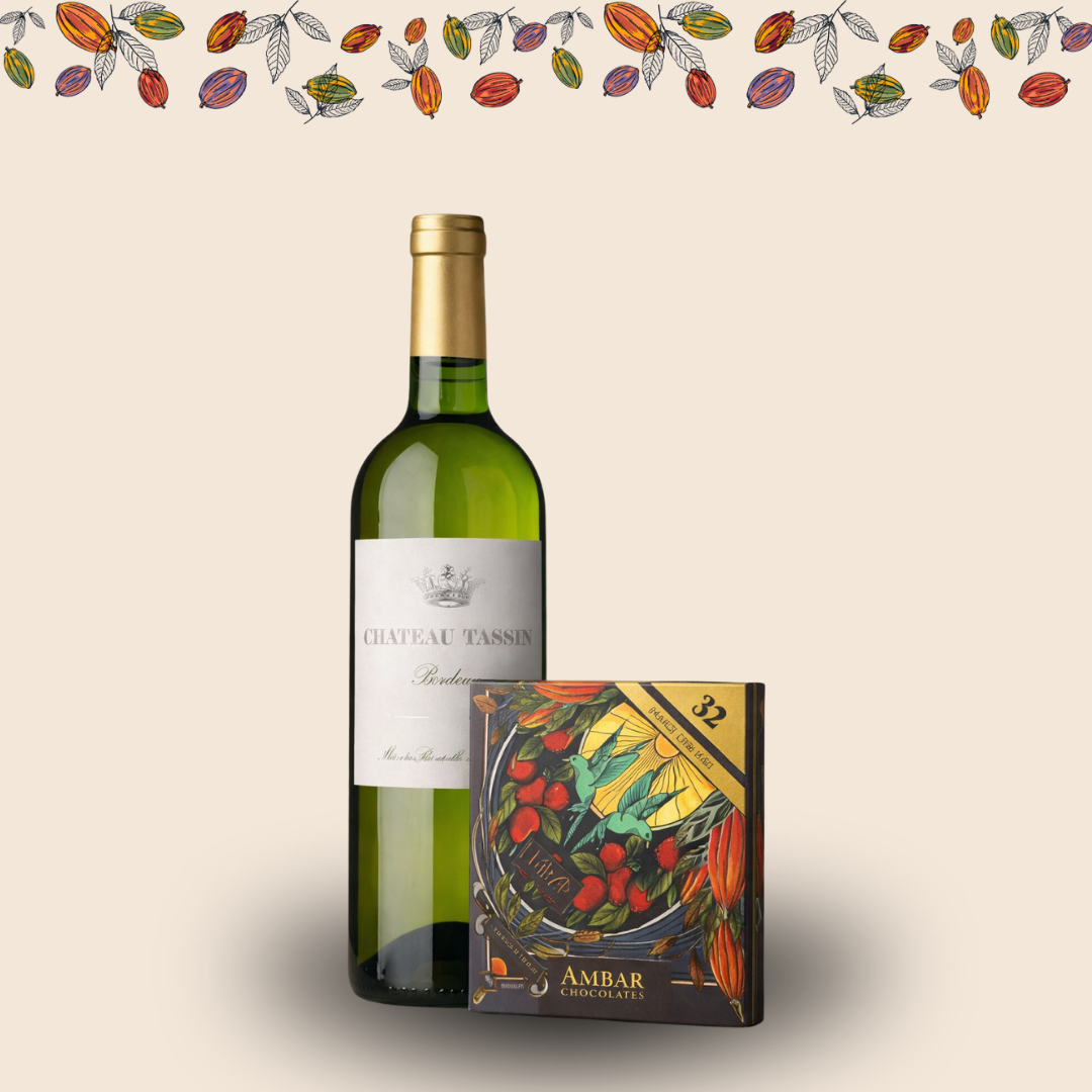 Chocolate branco com doçura delicada e boa intensidade aromática, para escoltar esta maravilha, nós escolhemos um vinho branco com acidez dramática, leve toque cítrico e uma média untuosidade, o vinho enxuga a boca com sua elegante acidez e deixa o chocolate muito amável.