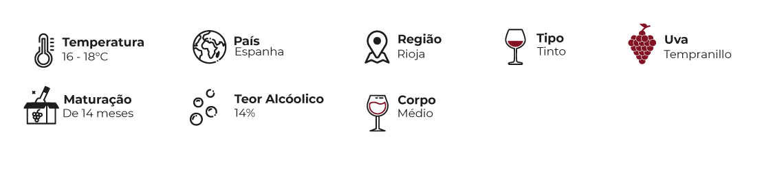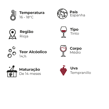 Técnica de Vinificação: É elaborado a partir da uva Tempranillo selecionada , fermentada em aço inoxidável sob temperatura controlada e com maceração das películas para extrair cor e estrutura. O vinho é então maturado em barrica bordalesa de carvalho americano por 14 meses, definindo seu caráter "Crianza". Este processo confere ao vinho um corpo médio e cor granada brilhante , com notas de carvalho e especiarias que se somam aos sabores frutados primários no paladar.