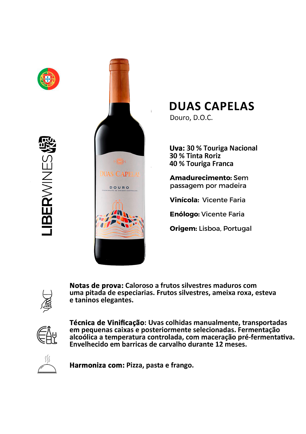 Duas Capelas Tinto é um vinho de corpo médio, equilibrado e com perfil gastronômico. Na boca revela boa acidez, taninos suaves e textura macia, destacando suas notas frutadas e final persistente. Ideal para harmonizar com pratos da cozinha mediterrânea e carnes grelhadas.