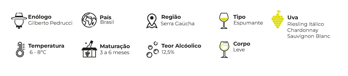 Elaborado pelo método Charmat, nasceu do assemblage das uvas Riesling Itálico, Chardonnay e Sauvignon Blanc. Apresenta leve doçura, boa cremosidade, frescor, equilíbrio e persistência.
