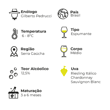 Notas de Prova: Coloração amarelo-palha com reflexos esverdeados, perlage fino e intenso. Os aromas remetem a flores brancas e frutas como pera, maçã verde e ameixa branca. Em boca, é levemente adocicado, cremoso, fresco e equilibrado, com boa persistência.