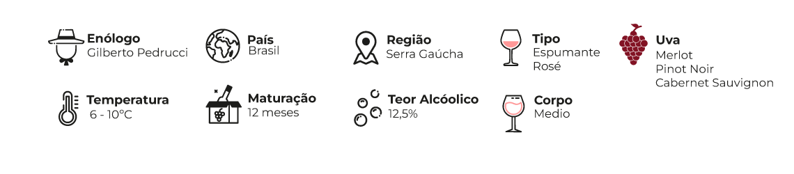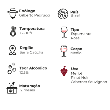 Este clássico da Casa Pedrucci com o assemblage das uvas Pinot Noir, Merlot e um toque de Cabernet Sauvignon resulta em um espumante equilibrado, com notas de frutas vermelhas como morango e amoras silvestres.
