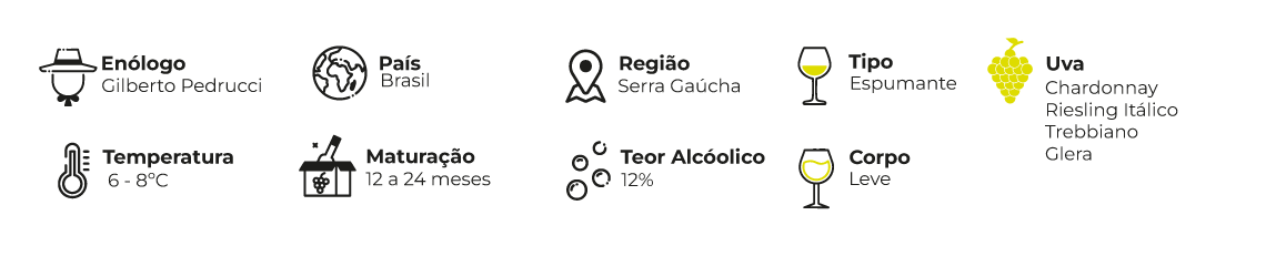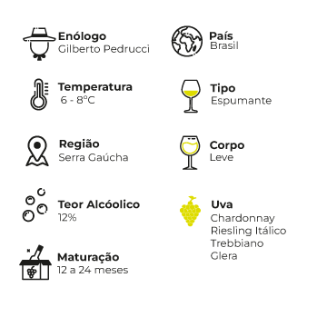 Este espumante possui uma personalidade singular, pois trata-se de um Blanc de Blancs elaborado com as uvas Chardonnay, Riesling Itálico, Trebbiano e Prosecco.