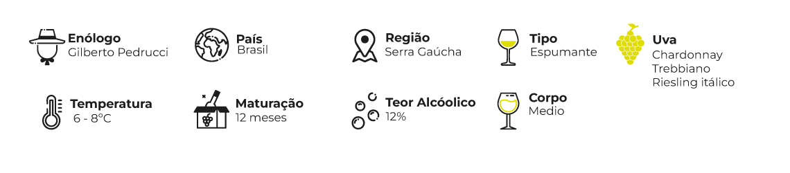 O Casa Pedrucci Reserva Nature 2020 é elaborado com as uvas Chardonnay, Pinot Noir e Riesling Itálico, permanecendo em maturação por 24 meses com grande personalidade.