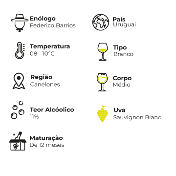 Notas de Prova: Cor amarelo-palha brilhante com tons esverdeados. No nariz é limpo, com boa intensidade aromática em que podemos encontrar nuances de flores brancas, manga e frutas cítricas. Na boca possui corpo médio, é frutado e apresenta acidez equilibrada.