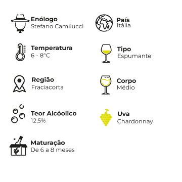 Notas de Prova: Apresenta coloração amarelo-dourada e borbulhas finas e persistentes. No nariz, revela delicadas notas florais e frutadas, acompanhadas por elegantes nuances de pão fresco e doces. Em boca, destaca-se pelo frescor e pela agradável sensação de pureza e vivacidade, resultando em um conjunto harmonioso e sofisticado, com final longo e elegante.