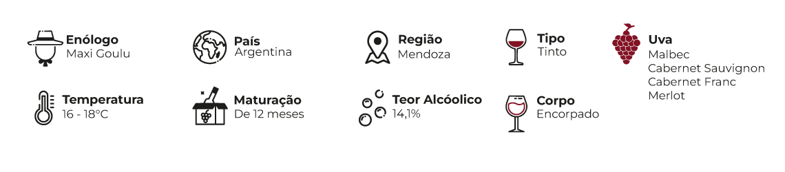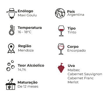 Notas de Prova: Vinho de cor vermelho intenso com reflexos violáceos brilhantes, apresenta aromas complexos e elegantes, onde se destacam a madeira de qualidade, as frutas maduras e sutis toques de especiarias. Em boca, revela bom volume e estrutura, com taninos equilibrados, leve adstringência e ótima harmonia entre doçura, acidez e corpo. As notas de baunilha, café e defumado, provenientes do estágio em barrica, completam o conjunto com sofisticação e persistência.