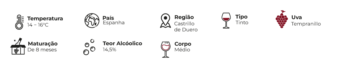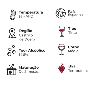 Notas de Prova: Vinho vermelho-cereja, limpo e brilhante, com tons violáceos. O nariz é muito expressivo, destacando os aromas primários característicos da uva Tempranillo e a presença de frutas vermelhas. Na boca, é um vinho equilibrado, com paladar suave e uma sensação agradável no final de boca.