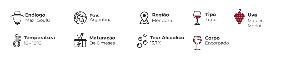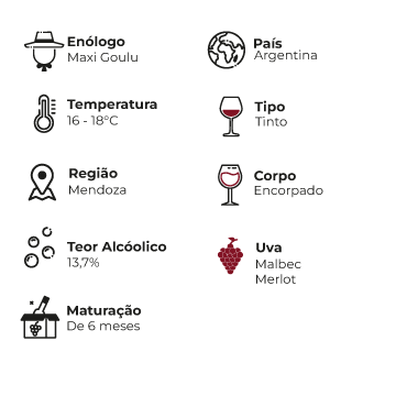 Notas de Prova: Cor vermelho rubi brilhante, que combina aromas de frutas vermelhas e pretas (como cereja e amora) com notas mentoladas e de especiarias. Na boca, é sedoso, equilibrado e amável, destacando-se pelos taninos elegantes e um toque de baunilha e chocolate da madeira bem integrada. O final é longo e persistente.