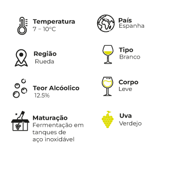 Notas de Prova: Apresenta tons de verde e amarelo de intensidade média, revelando sua juventude e frescor. No nariz, o Moyorido Verdejo exibe aromas vibrantes e frescos, com notas de louro e marmelo sobre um delicado fundo de frutas brancas. Em boca, mostra boa estrutura e equilíbrio, com acidez precisa e um final marcante que reforça seu caráter saboroso e refrescante.
