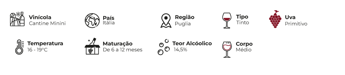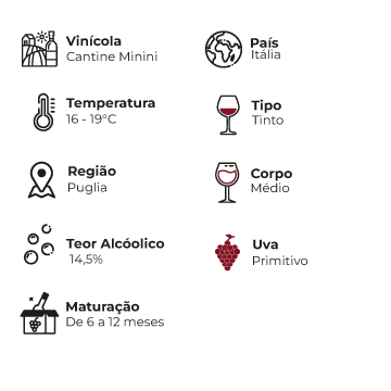 Técnica de Vinificação: O sistema de cultivo é o conhecido “alberello” (videira pequena), um método de cultivo muito antigo, sem irrigação. É feito com 100% de uvas Primitivo. As vinhas têm entre 30 e 50 anos e são plantadas com uma densidade de 5000 a 6000 plantas por hectares.
